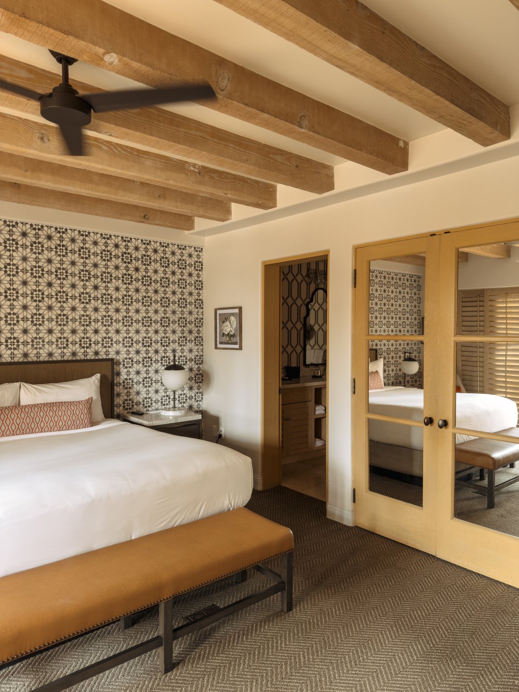 Natural light fills the rooms through large windows, enhancing the neutral, calming color palette. The design feels intentional and timeless, blending subtle nods to the hotel’s heritage with modern amenities. Comfortable beds, inviting seating areas, and generous storage make the rooms well suited for both short visits and extended stays.