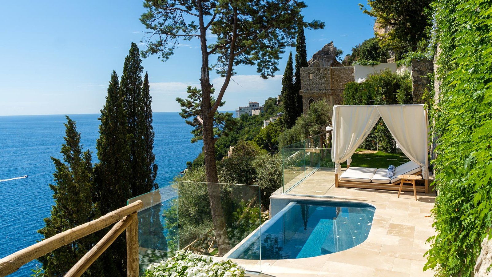 Borgo Santandrea sits on a dramatic cliff in Conca dei Marini, about 90 meters above the Tyrrhenian Sea, and it’s one of the rare Amalfi Coast properties that actually delivers on the promise of a private beach. The 45 rooms and suites blend contemporary Mediterranean design with vibrant mid-century touches, and select suites include private heated saltwater plunge pools where you can soak with nothing but sea and sky in view.