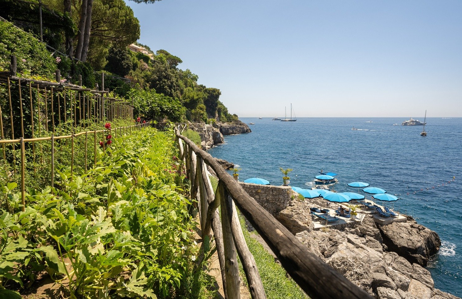 Every room opens onto a sea-view terrace where you’ll find yourself lingering over morning espresso and evening Aperol spritzes. The hotel’s rock-carved elevator descends to a private beach club where Il Carlino serves just-caught fish steps from the Mediterranean, while Michelin-starred Zass up top turns the hotel’s garden harvest into unforgettable tasting menus. A complimentary shuttle whisks you to Positano’s center whenever you want the village energy, though many guests find themselves happily anchored at the property—splitting days between the infinity pool, coastal boat rides, and that beachside terrace.